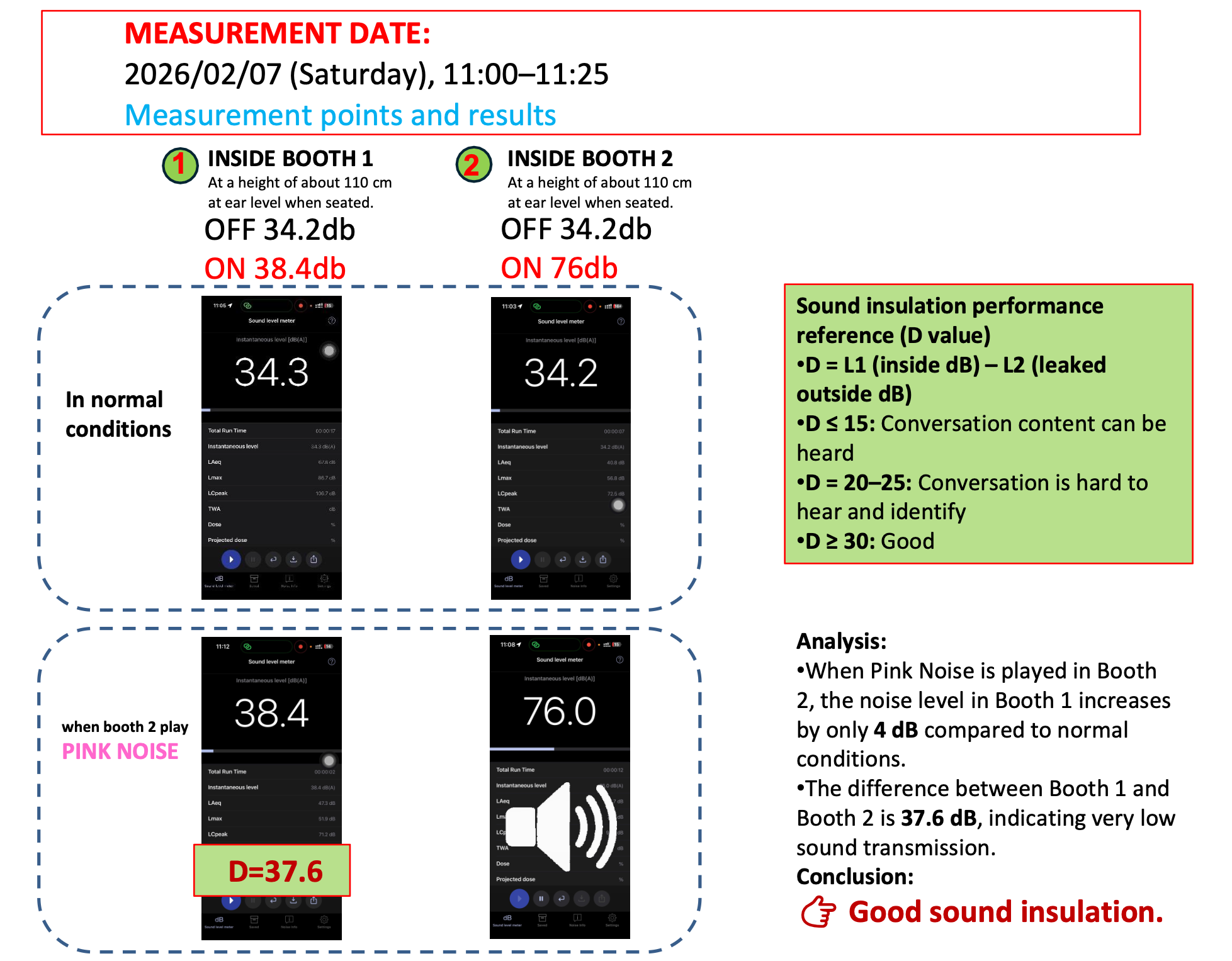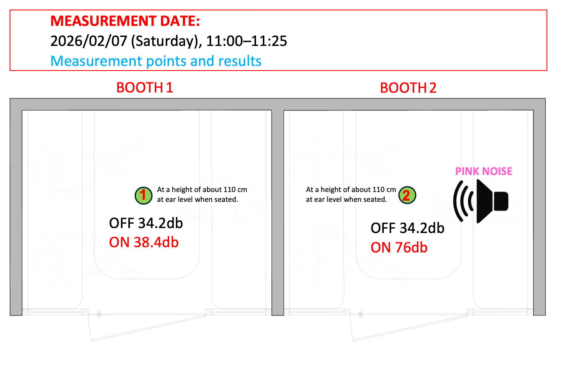 • 測定方法: 隣り合った「ブース1」と「ブース2」の片方のブース内で大音量のピンクノイズを再生し、隣のブースへの音漏れを測定し、騒音の差分を算出します。